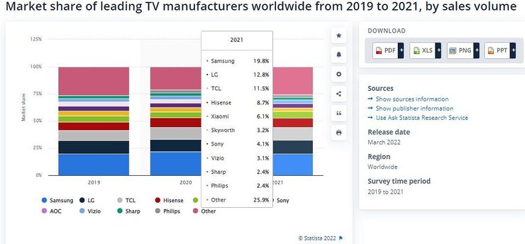 TCL пытается завоевать рынки США и Европы, но пока не добилась особых успехов. В связи с вышепречисленными проблемами ее продажи в этих регионах оказались довольно низкими, и по прогнозам экспертов, готовой показатель упадет на 3,6%. Xiaomi же должна сохранить свою позицию и продать примерно столько же панелей, что и в 2021 году.