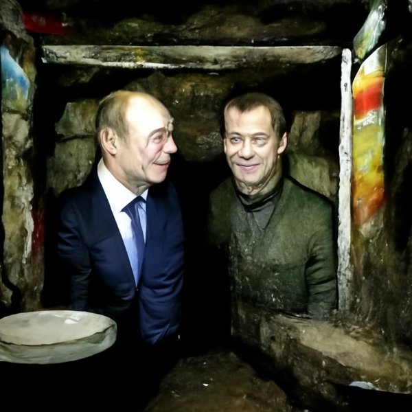 Стиль Midjourney более разнообразный и напоминает работы художников. Он изобразил, как Владимир Путин выглядывает наружу из бункера через окошко на двери. Несколько картин запечатлели президента РФ, в одиночку восседающего перед праздничным тортом с горящими свечами. Кроме того, ИИ показал Владимира Путина рядом с экс-премьером Дмитрием Медведевым в тесной комнате перед пустыми тарелками.
