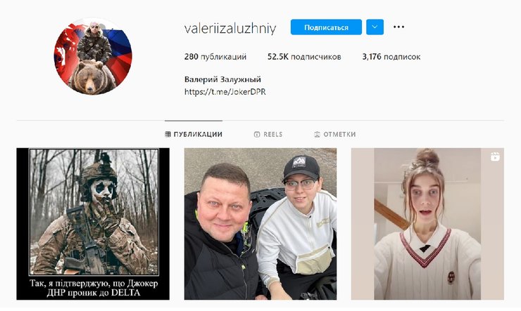 На странице, которая названа именем Валерия Залужного (valeriizaluzhniy) в социальной сети Instagram появилась аватарка с президентом РФ Владимиром Путиным, оседлавшим медведя на фоне российского триколора. Хакер разместил ссылку на свой Telegram-канал "Джокер ДНР" в шапке профиля и опубликовал фотографию с мужчиной в военной форме и гримом под персонажа Джокера из одноименно фильма 2019 года.