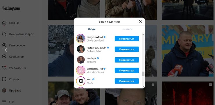 Не исключено, что Instagram-аккаунт фейковый. Во-первых, он не имел голубого значка, указывающего на то, что аккаунт верифицирован, т.е., что он подлинный и действительно принадлежит Залужному. Во-вторых, нас удивили аккаунты, на которые подписан "Залужный": гламурные инста-блогерши, бренд нижнего белья Victorias Secret..