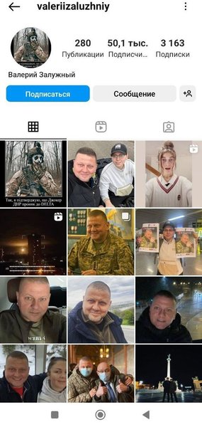 В-третьих, у аккаунта чуть более 50 тыс. подписчиков. При популярности главнокомандующего, думаем их было бы намного больше. В-четвертых, различные ведомства, которые имеют странички в Инстаграм, при упоминании имени Валерия Залужного в своих постах никогда его не отмечали под ником valeriizaluzhniy. В-пятых, если аккаунт в Instagram у главнокомандующего и был, то он не связан с его страницей в Facebook, хотя аккаунт в Твиттере и Телеграм, к примеру, на Facebook-странице указан.