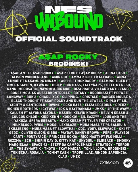 "Официальный саундтрек Need for Speed Unbound — это праздник музыки всего мира с более чем 70 треками из 25 стран! Откройте для себя новых исполнителей, представляющих множество поджанров музыки, выступающей за самовыражение и расширение прав и возможностей", — сказано на странице игры.