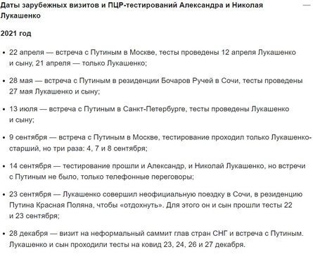 Перед большинством личных встреч Путина и Лукашенко сын последнего, Николай, также проходил ПЦР-тесты, предполагается, что отец брал его с собой. А вот перед мероприятиями, когда политики не встречались лично, Лукашенко-младший проверки на коронавирус не проходил.