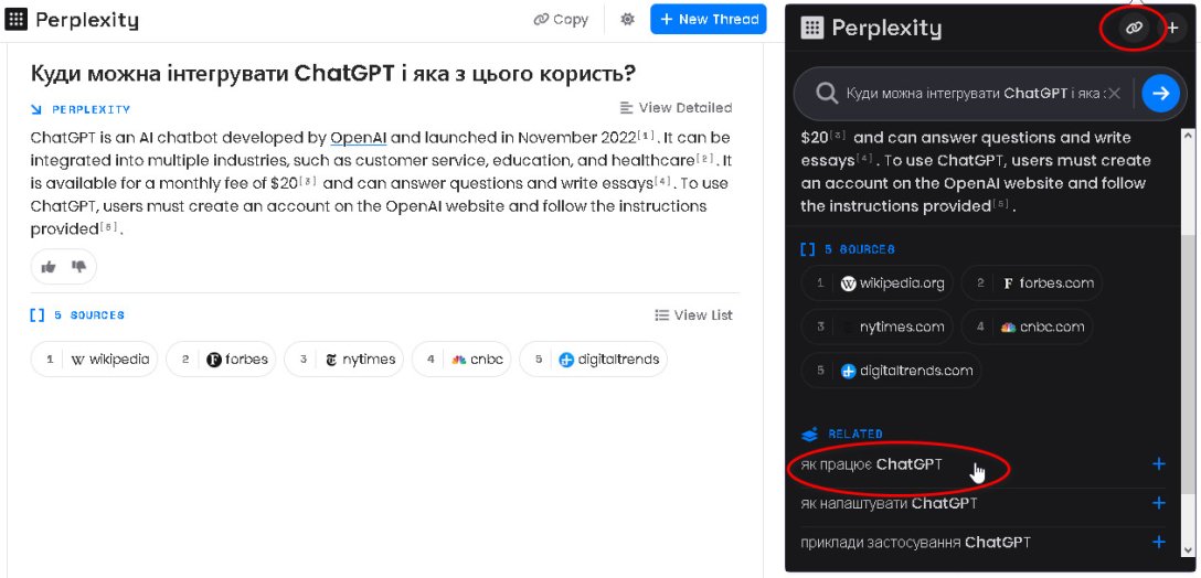 В качестве бонуса познакомим вас с расширением Perplexity. Этот продукт имеет посредственное отношение к ChatGPT, поскольку хоть и использует инструментарий чат-бота, но со своими значительными доработками. Так что, вполне возможно, в качестве стороннего ИИ-поисковика это расширение вам тоже пригодится. Оно помогает составлять дополнительные уточняющие вопросы к чат-боту и показывает ссылки по теме.