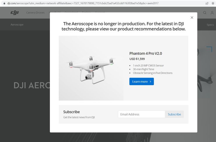 Страница сайта компании, посвященная AeroScope, сообщает, что продукт больше не производится. Закрыв это сообщение, можно просмотреть подробную информацию о системе, а внизу осталась форма заказа для диллеров DJI, но неизвестно, будут ли такие заказы выполняться.