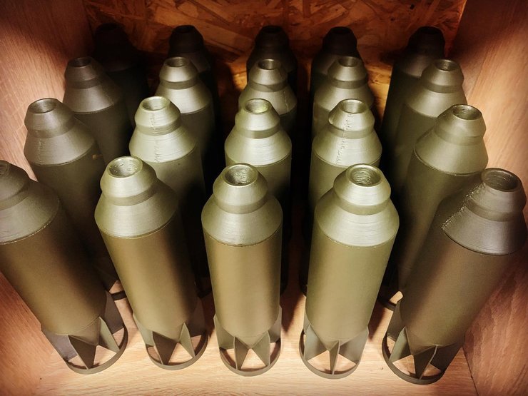 Волонтеры сделали для снаряда корпус диаметром 63 мм, напечатанный на 3D-принтере, с хвостовыми стабилизаторами для высокой точности и механическим носовым накалывателем, вызывающим взрыв при ударе. Внутрь поместили взрывчатку и множество металлических шариков (шрапнель), которые разлетаются во все стороны и поражают живую силу. Вес одного боеприпаса составляет примерно 800 грамм.