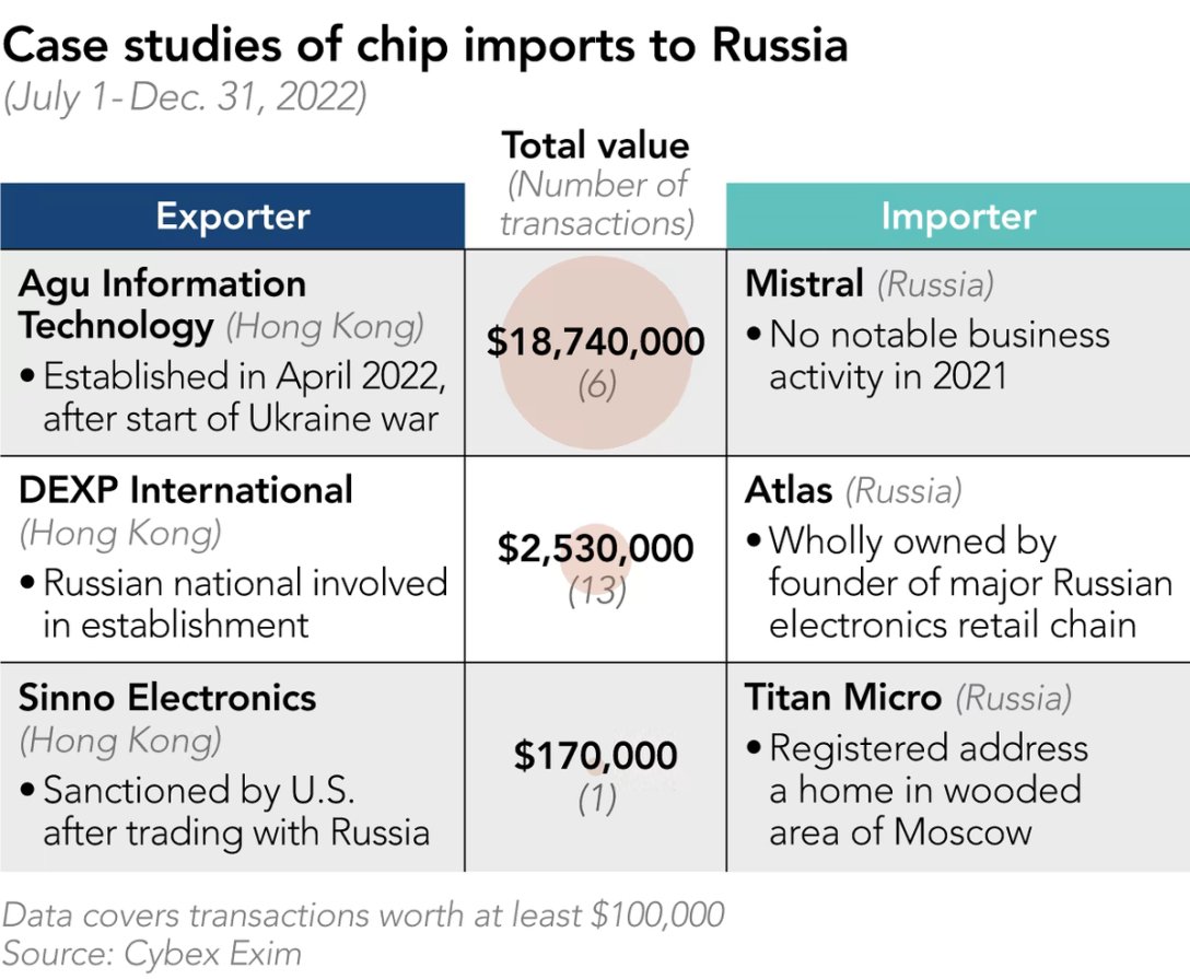 Например, удалось выйти на гонконгского дистрибьютора Agu Information Technology, которая закупает продукцию у Intel и Samsung. Согласно данным российской таможни, полученным от индийской исследовательской компании Cybex Exim, с сентября по декабрь 2022 года эта компания продала более 60 тысяч процессоров Intel российской компании Mistral. Некоторые из которых включали микропроцессоры по цене $13 000 за штуку.