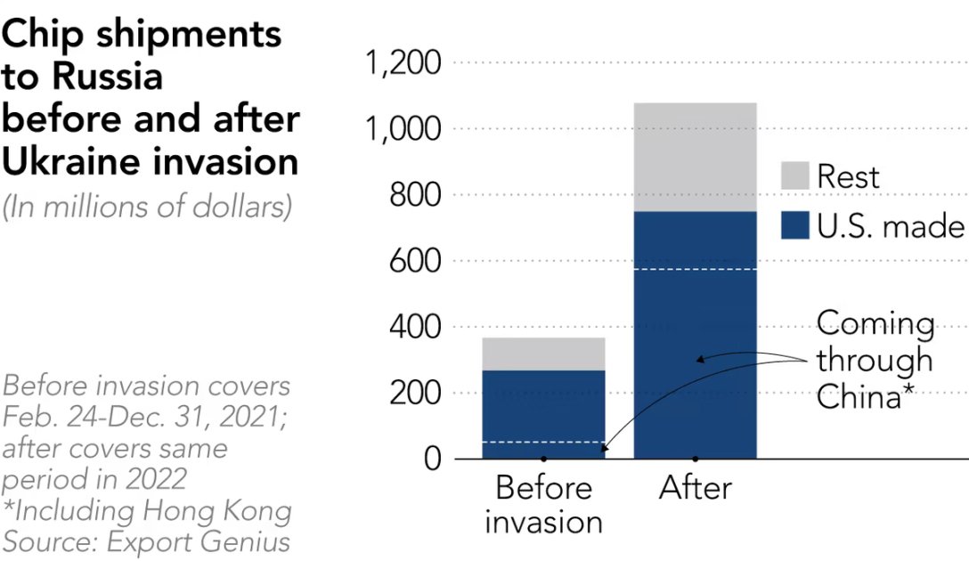 С момента вторжения России в Украину и после введения санкций, поставки чипов из Гонконга и Китая в РФ подскочили в десять раз, а главным перевалочным пунктом стала Индия. Кремль готова платить любые деньги, лишь бы получить желаемый санкционный товар.