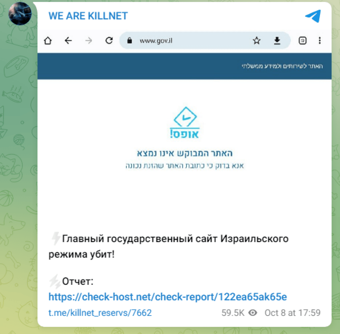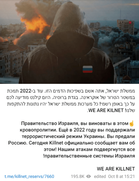 По словам хакеров, Израиль "предал Россию" тем, что поддержал Украину в 2022 году. Они предупредили о кибератаках на все государственные порталы страны.