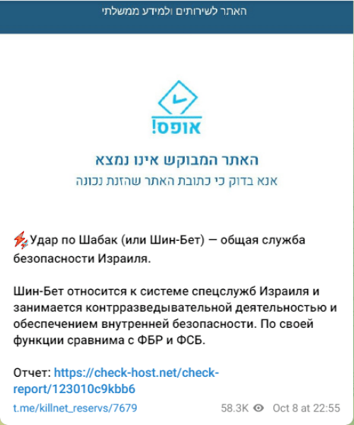 Позже в Killnet сообщили об "ударе" по сайту ШАБАК (Шин-Бет) — общей службы безопасности Израиля.