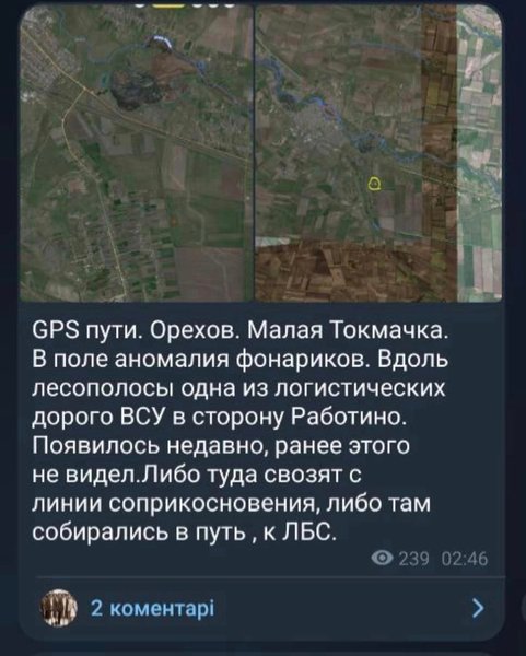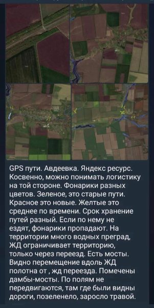 В доказательство он опубликовал скриншоты постов в одном из российских Telegram-каналов, к которым прикреплены карты с метками. Пишут, будто это маршруты украинских военных по данным спутниковой системы GPS. Россияне видят в сервисах "Яндекс", где смартфоны часто перемещаются вблизи Работино, Авдеевки, Орехова. Благодаря этому они оценивают логистику, узнают позиции "глушилок", возле которых дроны сбиваются с курса, и получают другую ценную информацию.
