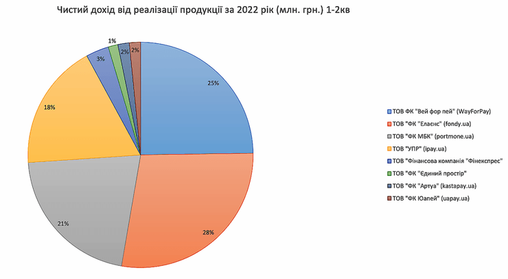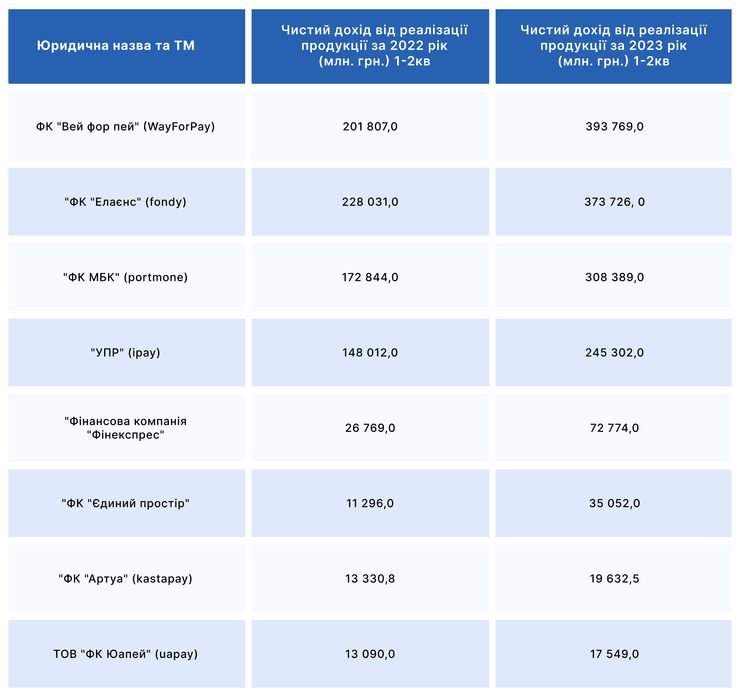 Основываясь на открытых данных НБУ можно проследить также, как сегодня выглядит рынок и распределение в отрасли. Анализ компаний на рынке Украины, занимающихся исключительно приемом онлайн-платежей, в цифрах при оценке выручки позволяет увидеть их позиции и положительную динамику за последние полтора года.