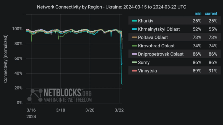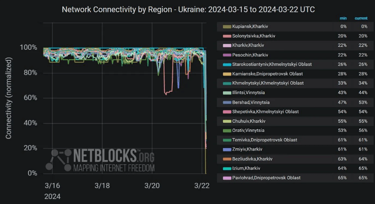 ВажноПо информации специалистов, в Купянске интернет отсутствует полностью. В Солоницевке уровень связи составляет лишь 20%. В Харькове и Песочине этот показатель на уровне 22%, а в Староконстантинове — 26%.