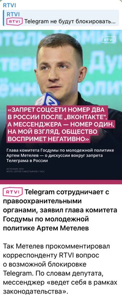 Так Метелев прокомментировал журналистам вопрос о возможной блокировке Telegram в России. По словам депутата, мессенджер функционирует "в рамках законодательства".