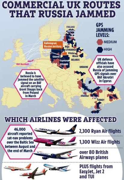 По информации журналистов, тысячи рейсов пострадали от, вероятно, российских помех, а авиационные источники назвали тактику "чрезвычайно опасной" и серьезной угрозой для безопасности полетов. Электронные атаки делают спутниковую навигацию бесполезной, поэтому самолеты не знают маршрутов и пытаются сообщить другим, где они располагаются.