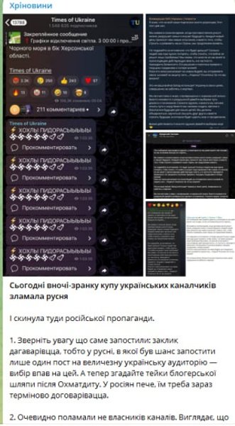 Украинский телеграм-канал "Хр*новини" разобрал вражеское сообщение и заявил, что взлому подверглись автопостинги тех каналов, которые пользовались российским ботом.