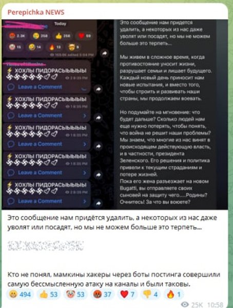 "Это сообщение нам придется удалить, а некоторых из нас даже уволят или посадят, но мы не можем больше это терпеть. Кто не понял, мамины хакеры через боты постинга сделали самую нелепую атаку на каналы и были такие", — написали в телеграм-канале Perepichka News.