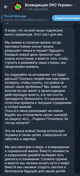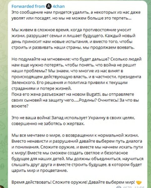Кроме украинских телеграмм-каналов подобные сообщения распространили и некоторые российские телеграмм-каналы и сами себя призывали "не воевать", но потом, вероятно, перечитали сообщение, вникли в его содержание и убрали из ленты.