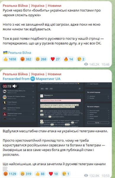"Р*сня через боты "бомбит" украинские каналы постами о "время сложите оружие". Никто из нас не защищен от этой угрозы, ведь пока не ясно каким образом так происходит. Поэтому в случае появления подобного руснявого поста в нашей ленте — предупреждаем, что это у р*саков порвало задницу, а у нас все ОК", — прокомментировали авторы телеграмм-канала "Реальная война".