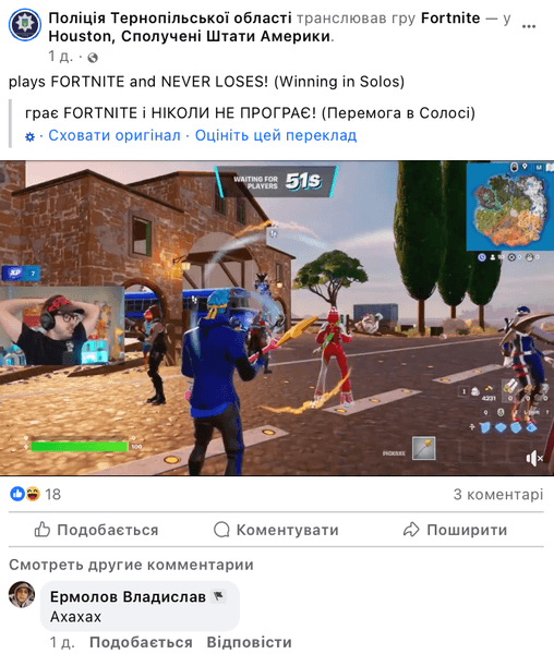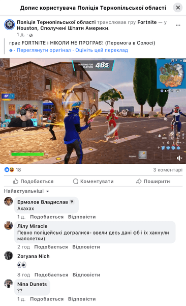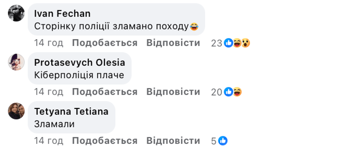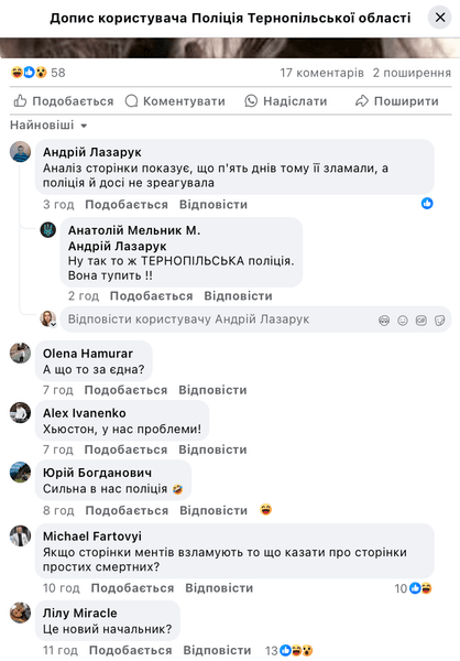 В комментариях украинцы делятся возмущением или удивлением, а также пишут о взломе. Также пользователи прибегают к шуткам, в частности, что такая медленная реакция — вполне ожидаемая в случае с тернопольской полицией.