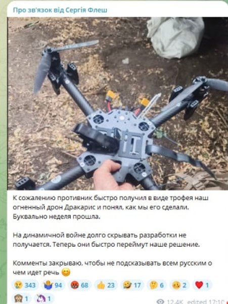 "К сожалению, противник быстро получил в виде трофея наш огненный дрон "Дракарис" и понял, как мы его сделали. Буквально неделя прошла", — написал он.