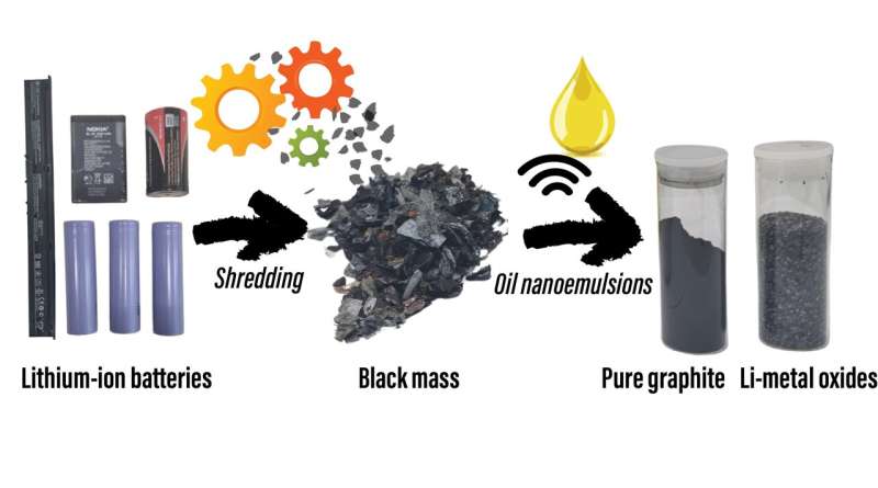 Эти нанокапли масла способны очищать отходы аккумуляторов, известные как "черная масса", поскольку они содержат смесь углерода (графита) и ценных оксидов металлов лития, никеля и кобальта.