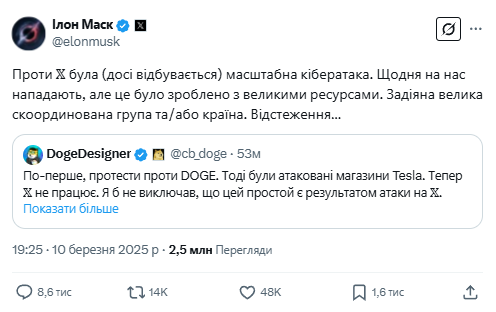 "За этим стоит скоординированная группа или страна": Маск заявил о кибератаке на соцсеть Х