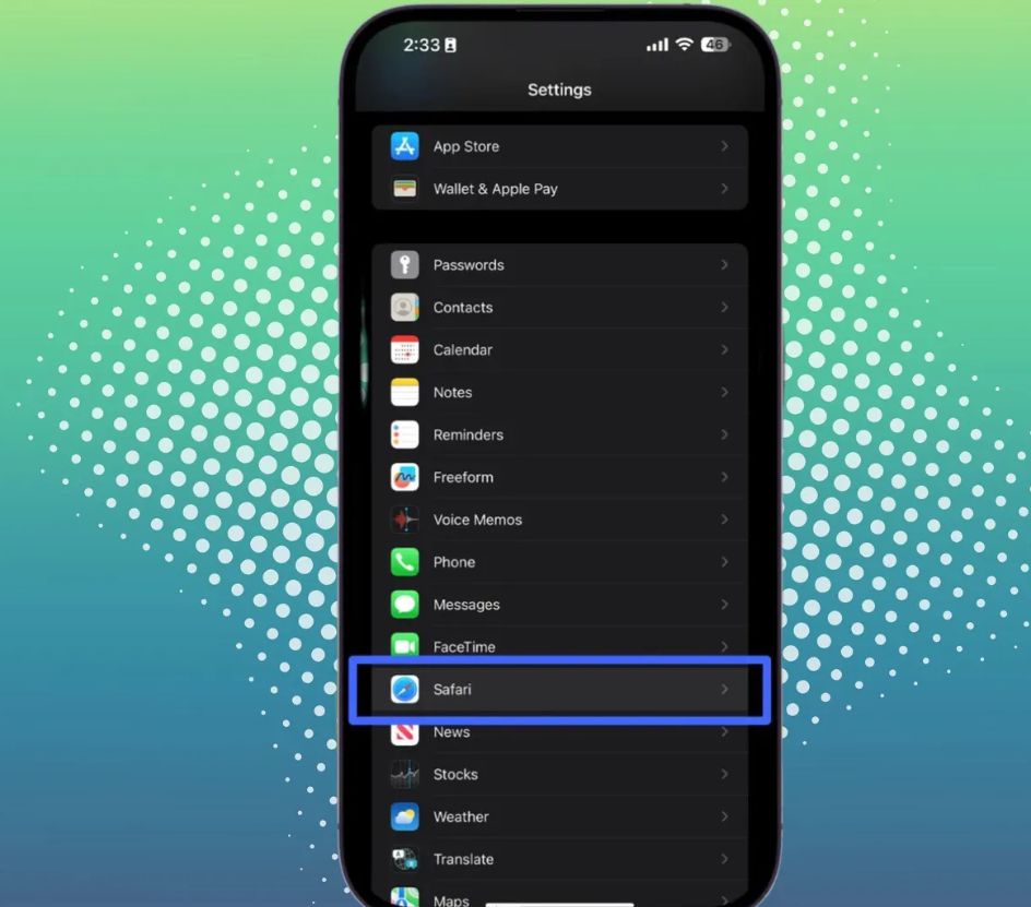 Найдите браузер Safari и коснитесь его, чтобы увидеть его параметры.