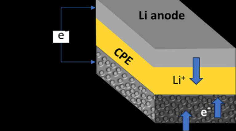 На иллюстрации показана литий-воздушная ячейка аккумулятора, состоящая из литиевого металлического анода, воздушного катода и твердого керамического полимерного электролита (CPE). При разряде и зарядке ионы лития (Li+) перемещаются от анода к катоду, а затем обратно.