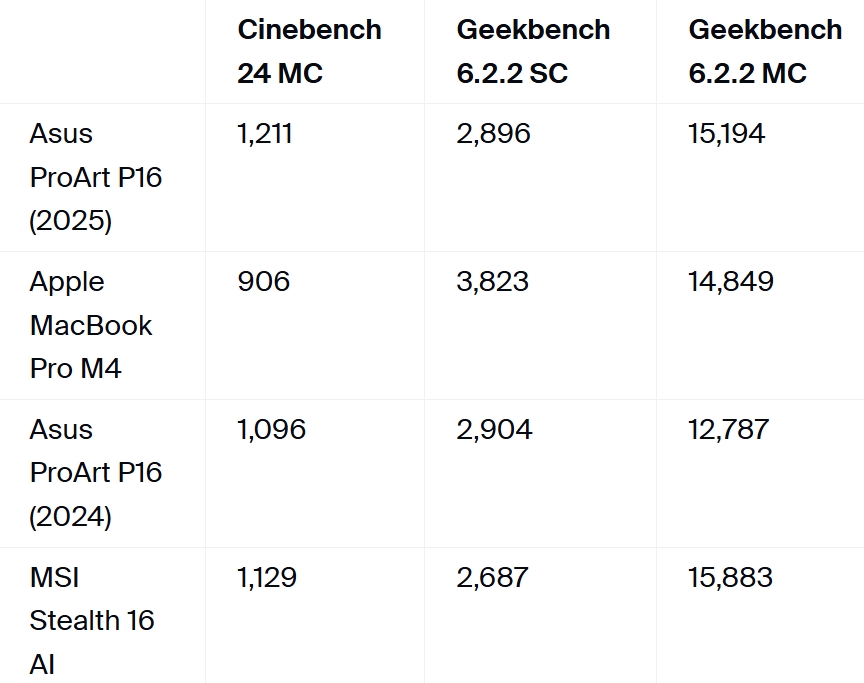 Результаты бенчмарков позволяют сравнить ProArt P16 2025 года с его предшественником, а также с M4 MacBook Pro и MSI Stealth 16 AI, другим ноутбуком схожего назначения. Новинка от Asus превосходит всех конкурентов во многих тестах.