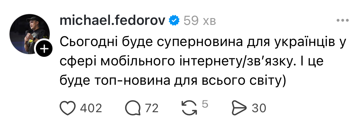 "Сегодня будет суперновость для украинцев в сфере мобильного интернета/связи. И это будет топ-новинка для всего мира", — написал вице-премьер-министр в Threads 12 августа.