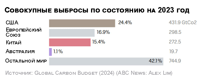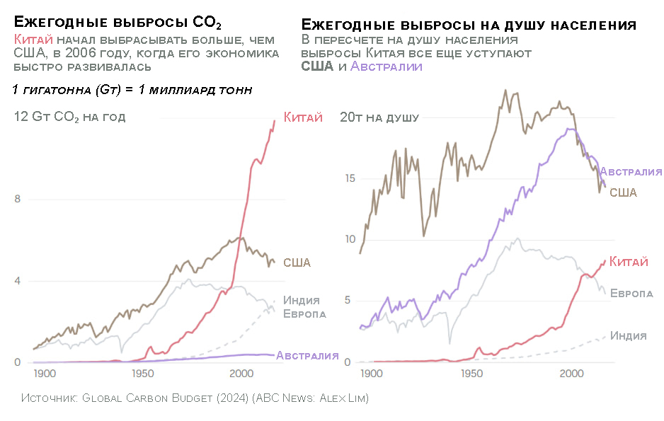 В 2006 году Китай обогнал США и занял первое место, однако США по-прежнему несут ответственность за наибольший исторический показатель — на их долю приходится четверть всех выбросов.