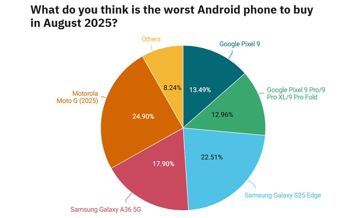 Как видно на диаграмме, Motorola Moto G (2025) набрал 3700 голосов, что соответствует доле в 24,9%. Так что он стал худшим выбором среди смартфонов в этом месяце.