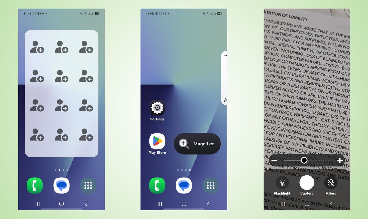 После активации интерфейс смартфона полностью преображается. Текст и иконки становятся значительно крупнее, что упрощает чтение и навигацию. Домашний экран реорганизован: вместо ленты Google Discover появляется специальная страница для быстрого набора избранных контактов. Свайп влево от главного экрана открывает быстрый доступ к инструменту "Лупа", который использует камеру для увеличения мелкого текста.
