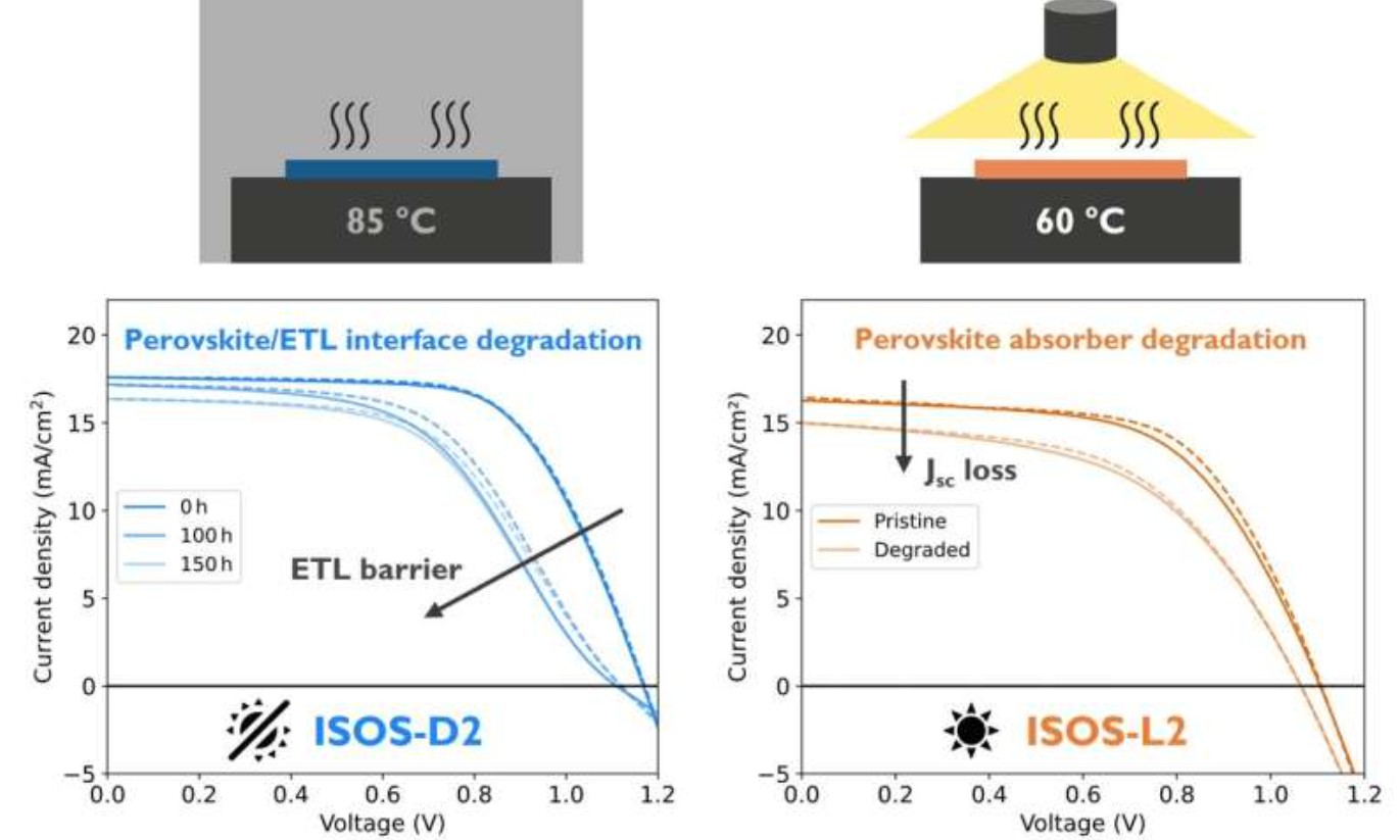 - В темноте (протокол ISOS-D2): При термическом стрессе без освещения главной причиной отказа становятся слои, отвечающие за транспорт заряда. Проблема возникает на стыке перовскита и этих слоев.