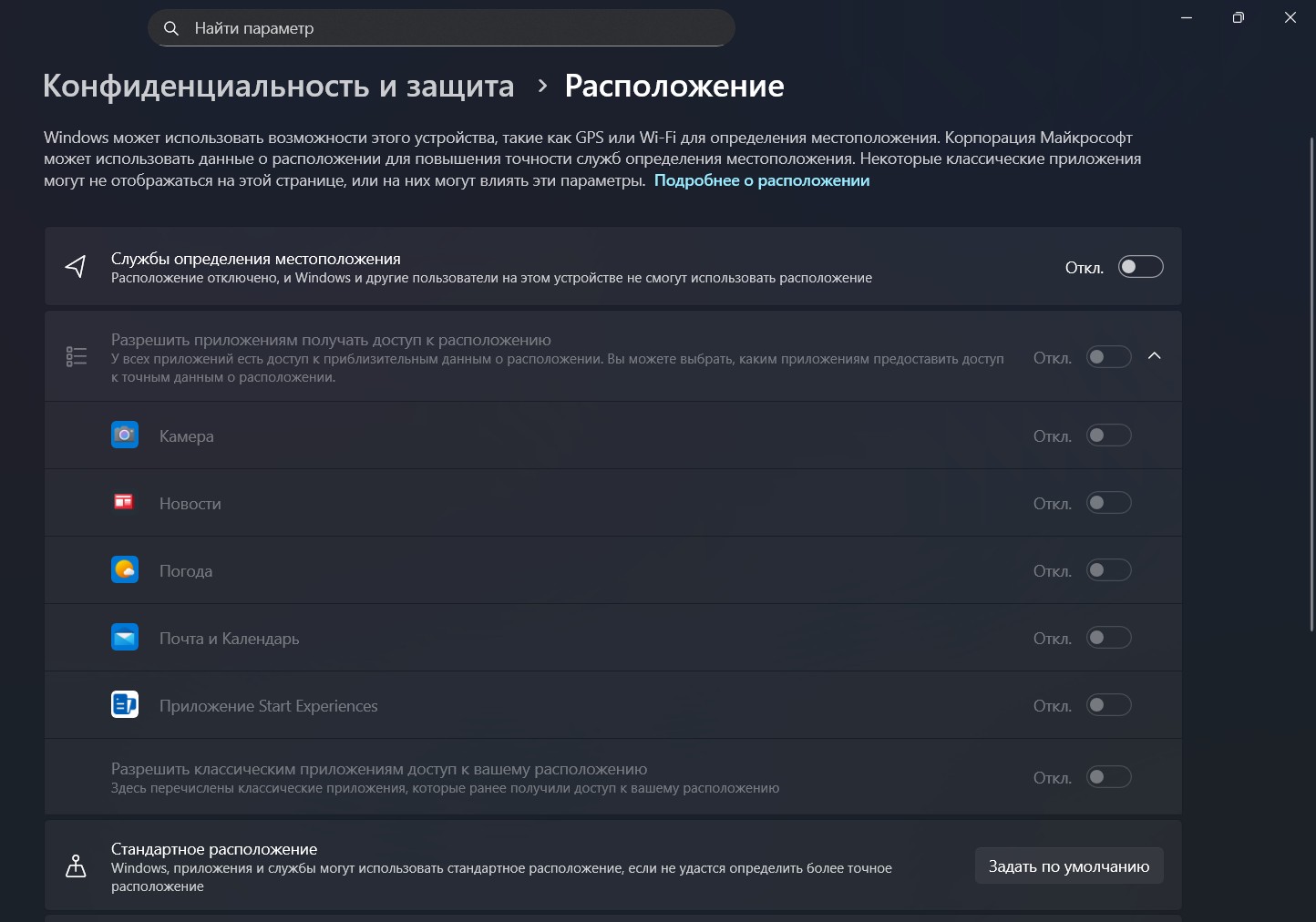 Зайдите в "Параметры" > "Конфиденциальность и защита" > "Расположение". Внимательно просмотрите список программ и отключите доступ для всех, кроме тех, которым он действительно необходим (например, карты или погода).