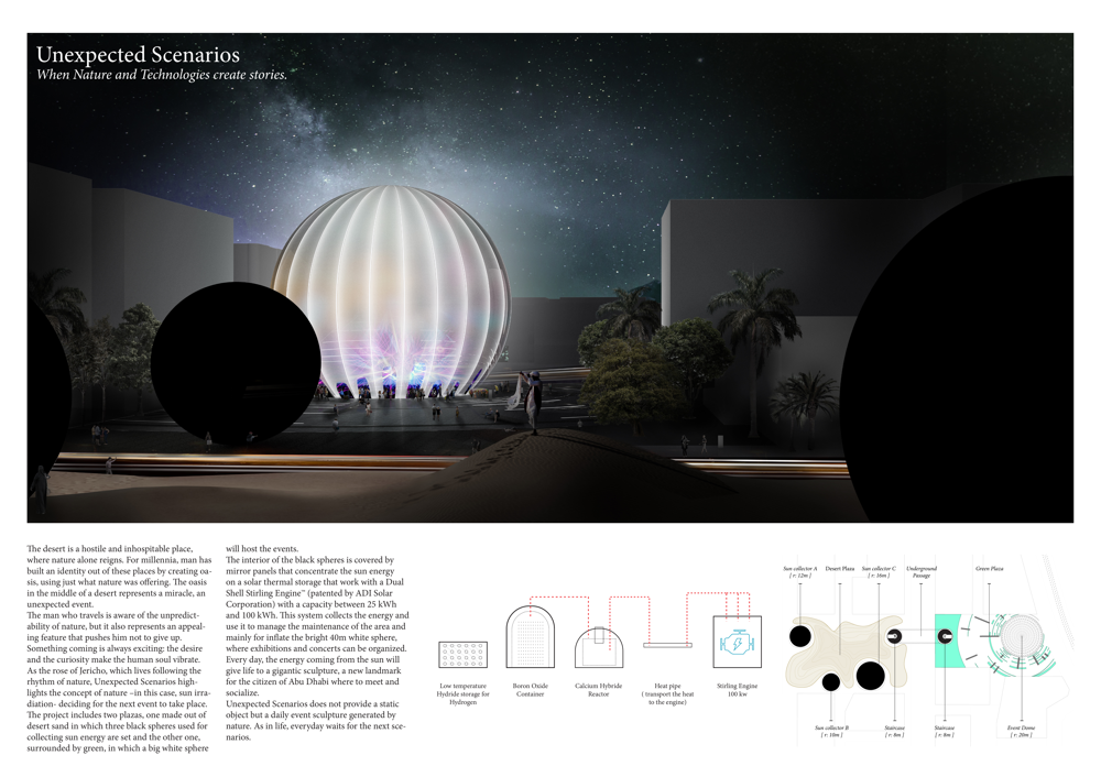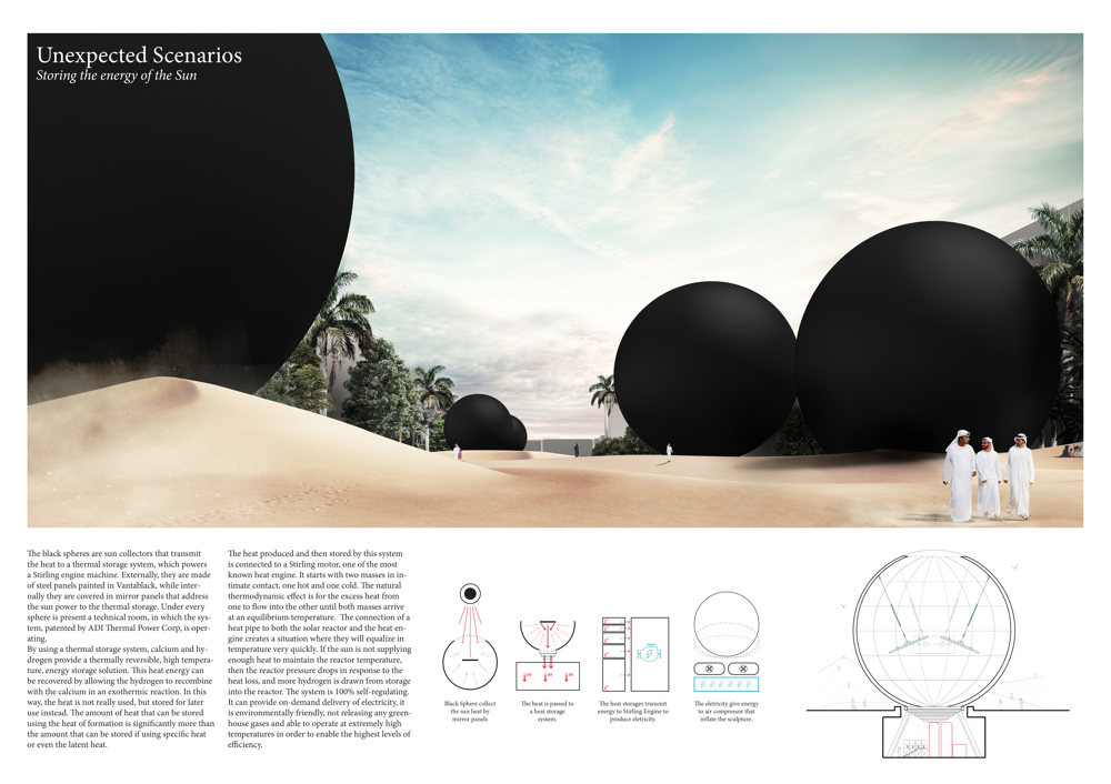 Проект Unexpected Scenarios предлагает устройства для получения энергии и генерации тепла в пустыне. Он может выдавать 175 МВт*ч в год.