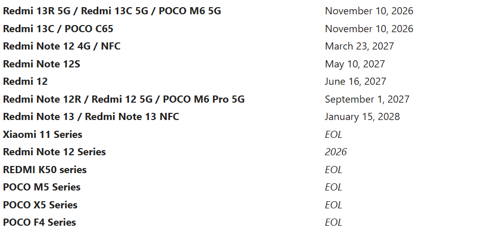 Как видим, сроки варьируются от ноября 2026 года до января 2028-го. Для некоторых моделей – например, Redmi Note 12 Series – точной даты нет, заявлен только год (в данном случае – 2026). А еще ряд устройств получили отметку EOL (End-of-Life product). Она означает завершение жизненного цикла устройства, после которого производитель прекращает его производство, поддержку и обновления.