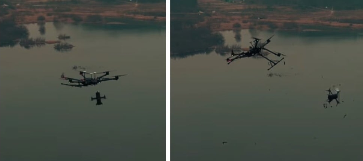 Судя по опубликованным кадрам, KAiDEN поражает цели путем тарана, и неизвестно, использует ли боевую часть. На фото он поразил крупный гексакоптер над водоемом.