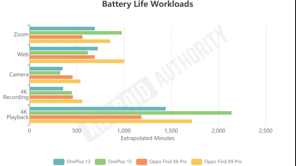 Также эксперты сравнили OnePlus 15 и OPPO Find X9 Pro с их предшественниками. Оказалось, что у OnePlus 15 время работы на 19% дольше по сравнению с OnePlus 13, а OPPO Find X9 Pro выиграл у предыдущей модели X8 Pro еще больше – около 37%. Такая разница, вероятно, связана еще и с чипсетами (Snapdragon 8 Elite Gen 5 и MediaTek Dimensity 9500 соответственно).