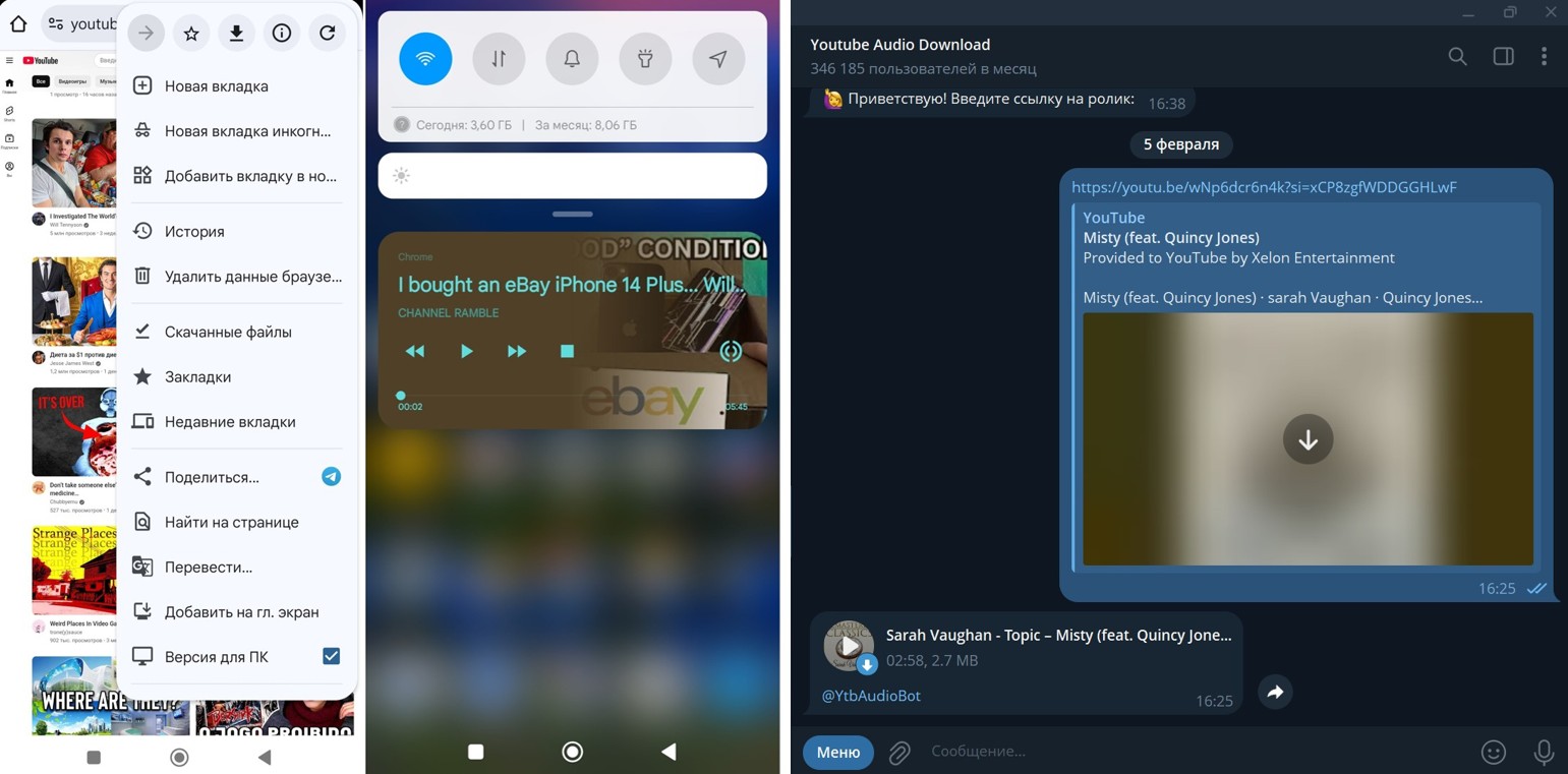 Прослушивание YouTube фоном в браузере и мессенджере Telegram