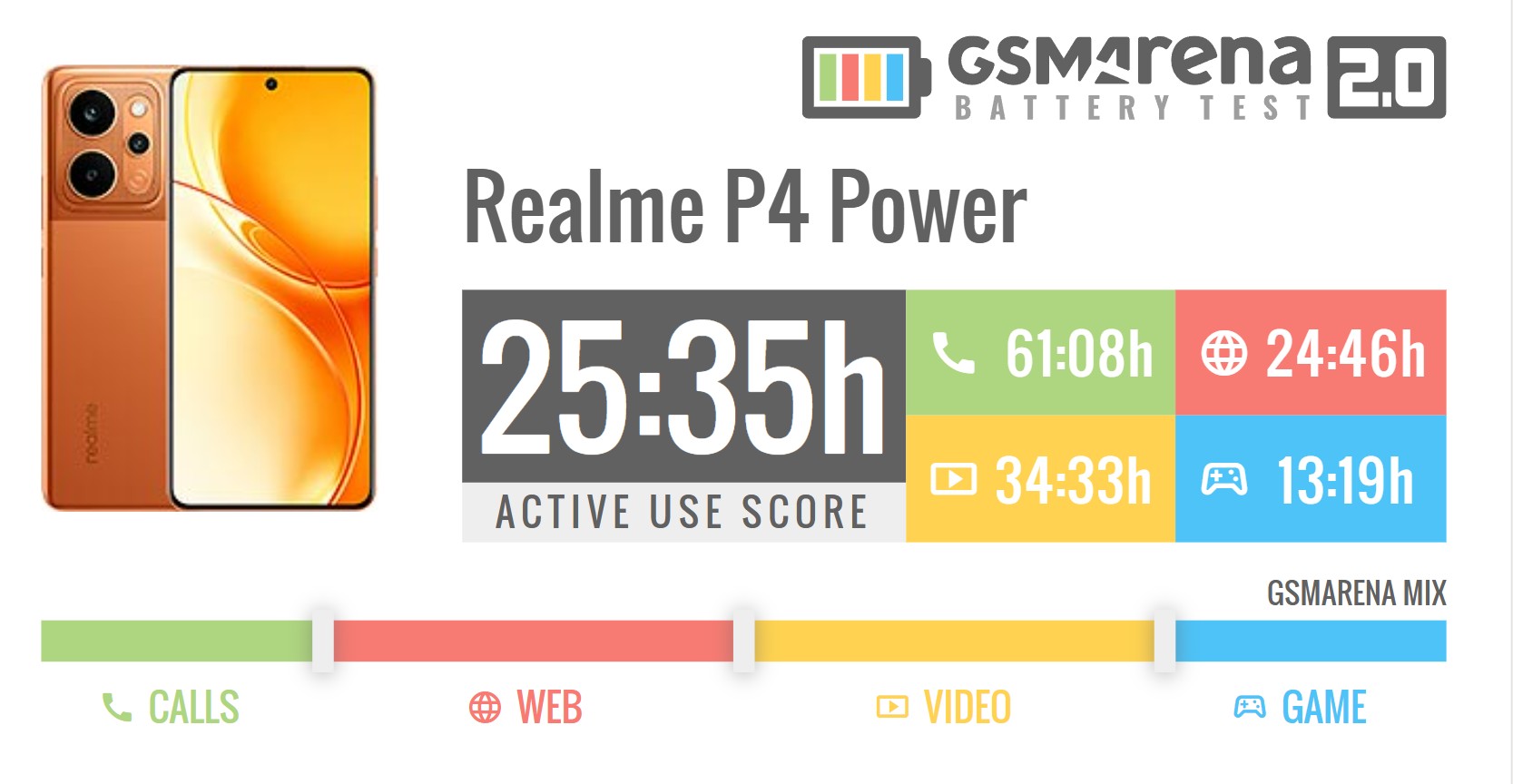 В тесте активного использования (Active Use Score) смартфон продержался невероятные 25 часов 35 минут. Это лучший результат в базе данных GSMArena на момент публикации. Показатель высчитывается исходя из смешанного сценария с несколькими задачами, соотношение которых задали эксперты. Если говорить о разных типах нагрузки в изоляции, статистика получилась следующей: