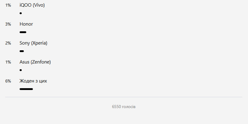Недавно Фокус решил узнать, какие бренды смартфонов предпочитают наши читатели. В опросе, который длился до 31 марта, приняли участие 6550 человек.