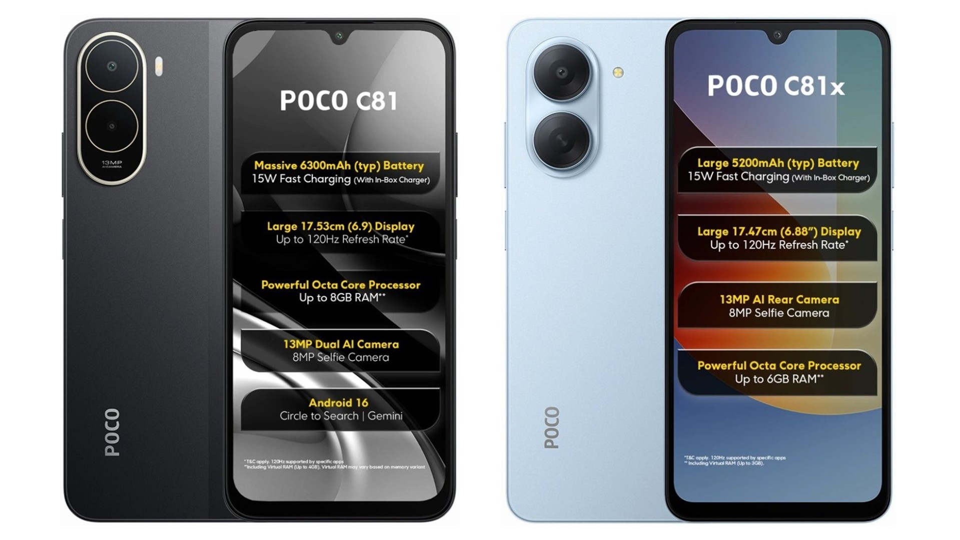 • Poco C81x (3/64 ГБ): 9999 рупий (около 105 долларов). Цвета: голубой (Ice Blue) и черный (Crystal Black).