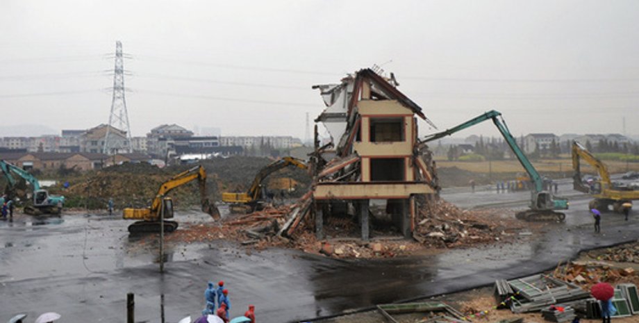Пятиэтажный дом 67-летнего китайца стоял на своем месте из-за закона о частной собственности, дающего людям право остаться в своем старом жилье, если компенсация за переезд, которую предлагают власти, кажется им неудовлетворительной.