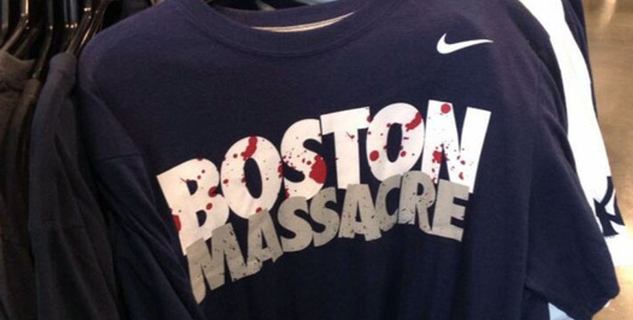 Компания Nike изъяла из продажи футболки с надписью Бостонская резня (Boston Massacre), сообщает ИТАР-ТАСС, ссылаясь на главный офис компании, расположенный в предместье города Бивертон.