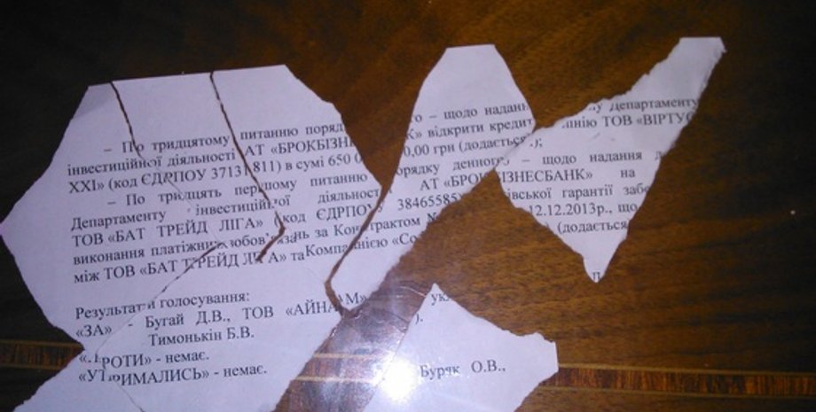 Документ пытались уничтожить. На уцелевших остатках видно, что за это решение голосовали председатель наблюдательного совета банка Денис Бугай, замглавы наблюдательного совета группы ВЕТЭК Борис Тимонькин, а также один из акционеров "Брока" - юрлицо ООО "Айнам".