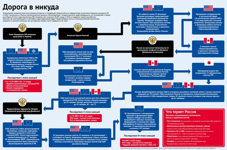 Агрессивная внешняя политика, аннексия Крыма и поддержка пророссийских террористов на востоке Украины вынудили ЕС и США применить к России экономические санкции, сопоставимые с ограничениями, действовавшими по отношению к Ираку или Ирану. В этом году экономика РФ потеряет от санкций как минимум $100 млрд, в 2015-м падение может усугубиться. Прогноз не окончательный: в сентябре меры Евросоюза будут пересмотрены. Если в итоге российская экономика окажется в полной изоляции, ее суммарные потери могут превысить $1 трлн.