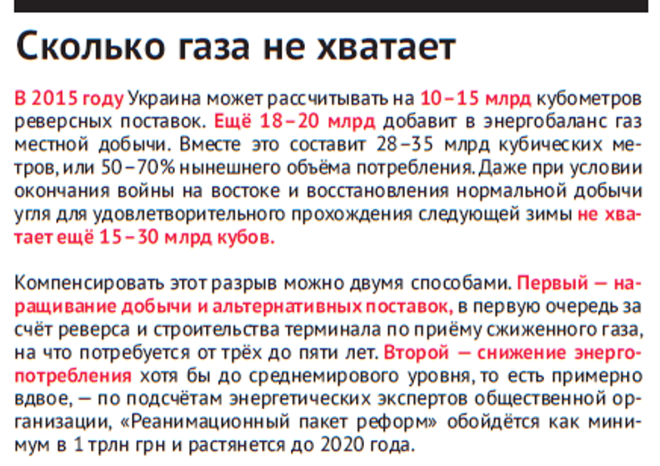 Реверс, сознательность граждан и статистика экономии дали правительству повод для оптимизма. Но уже в конце августа премьер Арсений Яценюк сообщил, что Украине требуется около 5 млрд кубометров газа, под покупку которых на счетах Нацбанка зарезервировано $3,1 млрд. Наиболее вероятный поставщик — Россия.