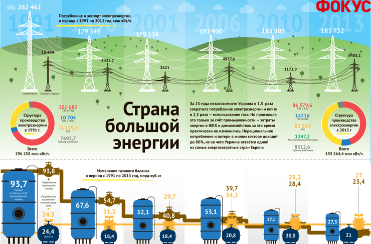 Последнее обстоятельство выглядит парадоксальным, ведь за 23 года общее энергопотребление в стране сократилось более чем в два раза: с 245 млн до 116 млн тонн нефтяного эквивалента в год. Кроме того, нынешняя ситуация кардинально отличается от 1991 года, когда Украина импортировала из России не 28 млрд, а почти 94 млрд кубометров газа. Тогда прекращение российских газовых поставок вызвало бы коллапс энергосистемы — уголь просто не мог покрыть такого дефицита.